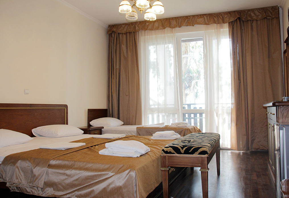 2-местный стандарт расширенный (макс. 2+2 чел., 24-30 кв. м, телевизор, кондиционер, душ, балкон, 2-спальная кровать, сушилка раскладная (для белья), мини-холодильник, туалет). Доп. место - еврораскладушка/кровать, может быть установлена без ограничения по возрасту..