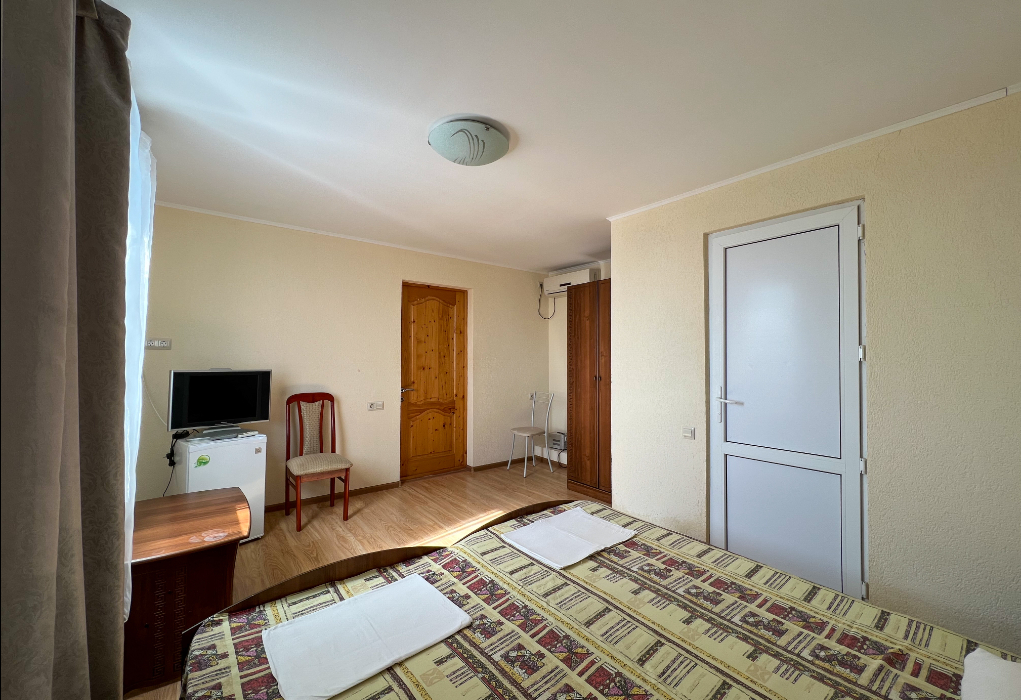 2-местный стандарт без балкона (макс. 2+1 чел., 18 кв. м, Wi-Fi, телевизор, кондиционер, душ, фен, туалетные принадлежности, сейф, стул, 1-спальные/ 2-спальная кровать, прикроватные тумбочки, журнальный столик, шкаф, зеркало, мини-холодильник, туалет, сушилка для белья, чайная станция, пуф, общая терраса).