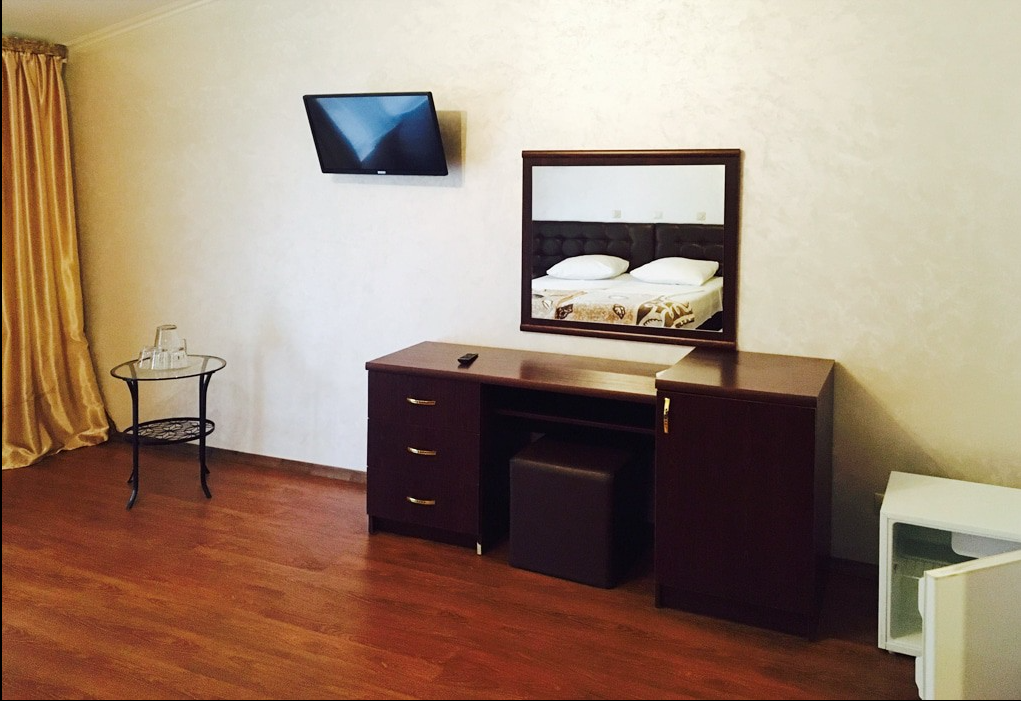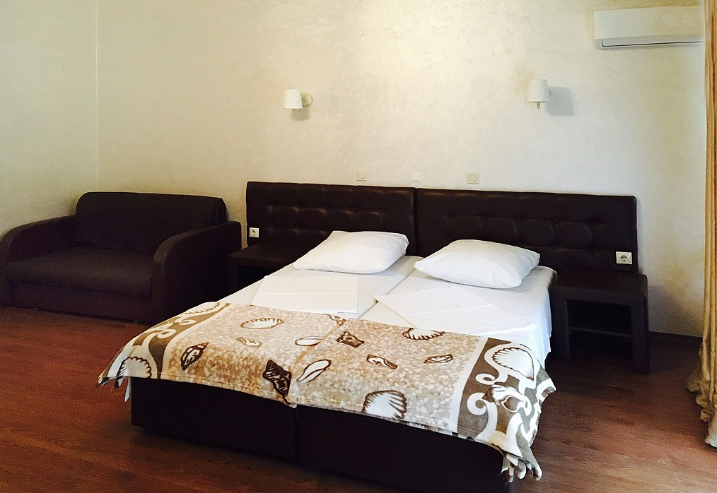 2-местный люкс (макс. 2+1 чел., 20 кв. м, Wi-Fi бесплатный в номере, телевизор, спутниковое телевидение, кондиционер, душ, фен, холодильник, балкон, мебель на балконе, 2-спальная кровать, прикроватные тумбочки, шкаф, туалет, кофейный столик). Доп. место - кровать, может быть установлена без ограничения по возрасту.